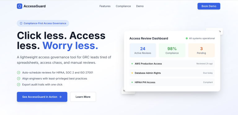 AccessGuard is a smart, lightweight solution that helps growing cloud teams stay secure and audit-ready. It automates access reviews, flags risky permissions, and simplifies least-privilege compliance for SOC2 and HIPAA. Built for startups, it fits seamlessly into tools teams use like AWS, GCP, GitHub, Slack and Notion. No heavy setup, no complexity, just clear, actionable visibility and one-click fixes. Designed for DevOps speed, trusted by GRC teams.